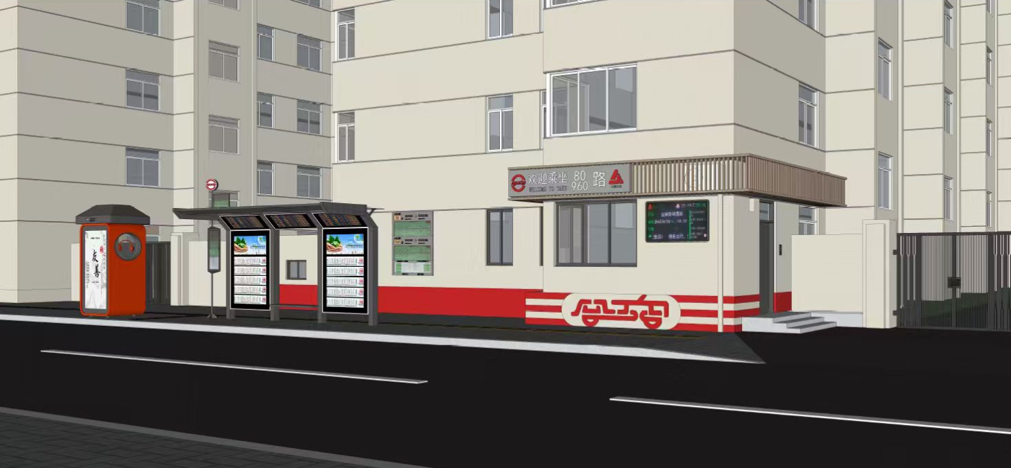本項目亮點旨在民生細節與智慧融合,通過全要素精細化改造、人性化設計、集約化利用空間等手段,打造綠色與智能并行的公交設施。本次整治范圍涵蓋候車廊、投影區域鋪裝、盲道、扶手等基礎設施,同步更新路別牌、四牌一圖、信息屏、站桿及防護欄,實現從功能到美學的全域提升。調度管理用房與候車區也將通過模塊化設計優化布局,緩解中心城區空間壓力。
